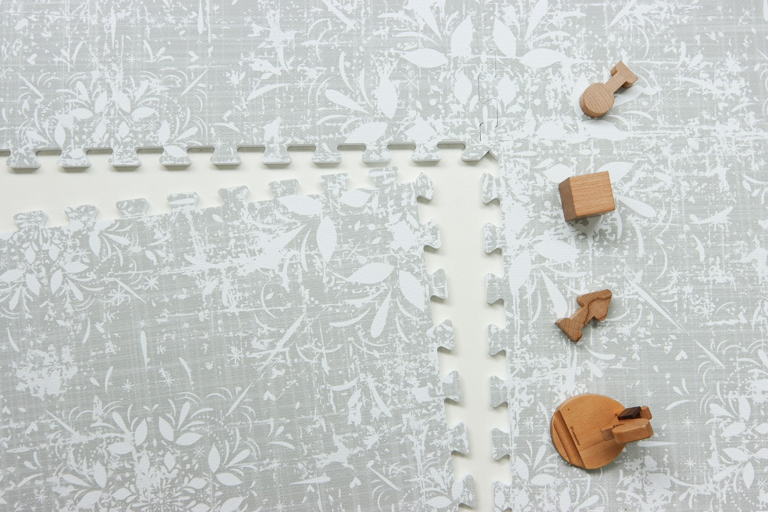 Le tapis de jeu Jasmin, inspiré de l'élégance des tapis persans fleuris, est disponible en vert sauge et gris. Doté d'une base neutre ornée d'illustrations blanches dessinées à la main, il allie harmonieusement style et fonctionnalité.